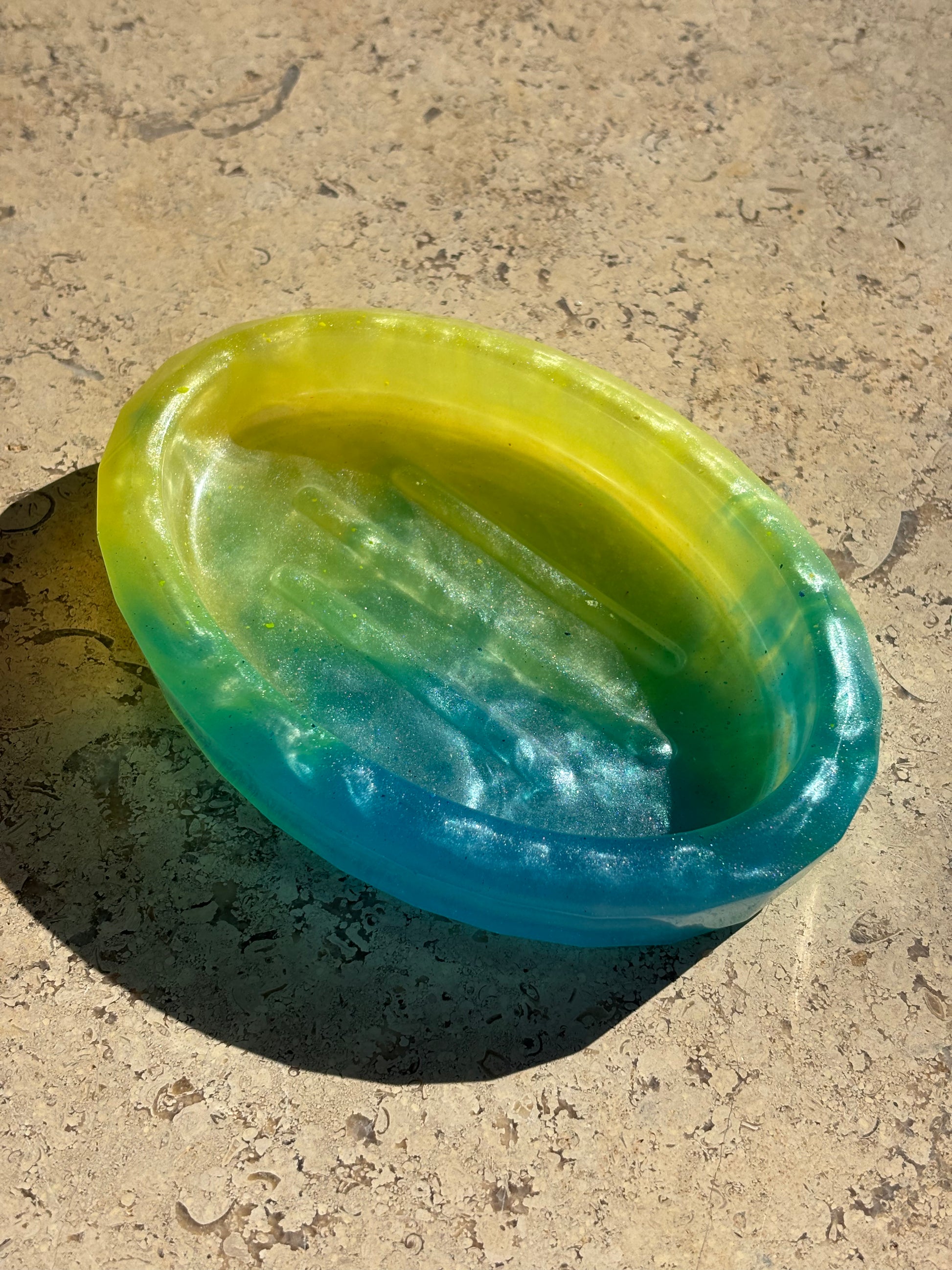 This set includes 3 coasters with a holder, a toothbrush cup, soap holder, and a small box.