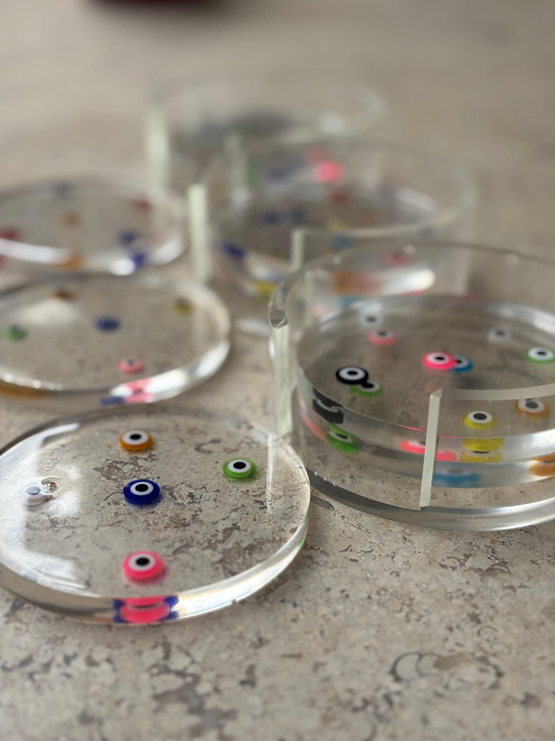 A fun and colorful set of 3 handmade resin coasters with colored evil eyes, plus a holder.