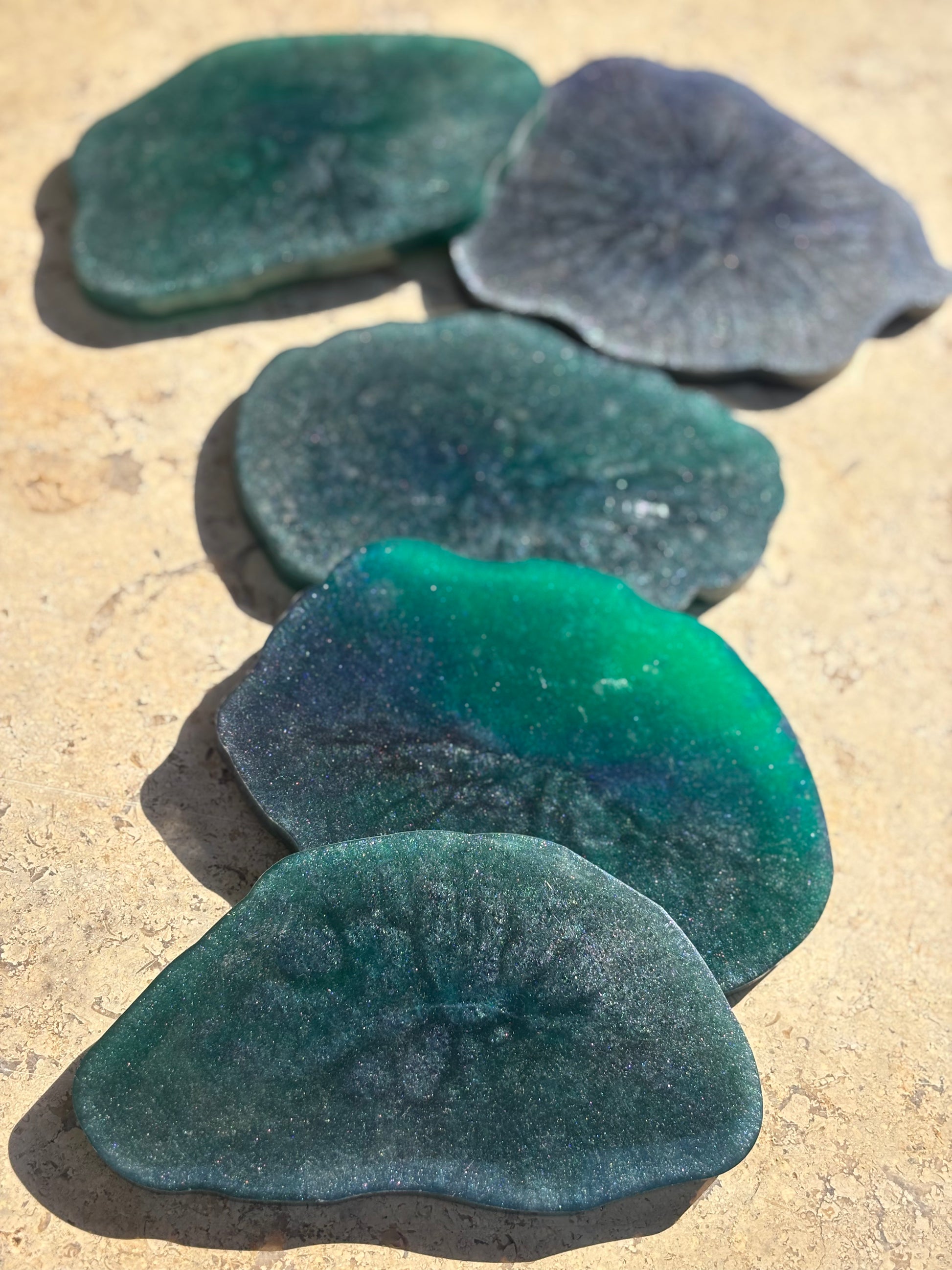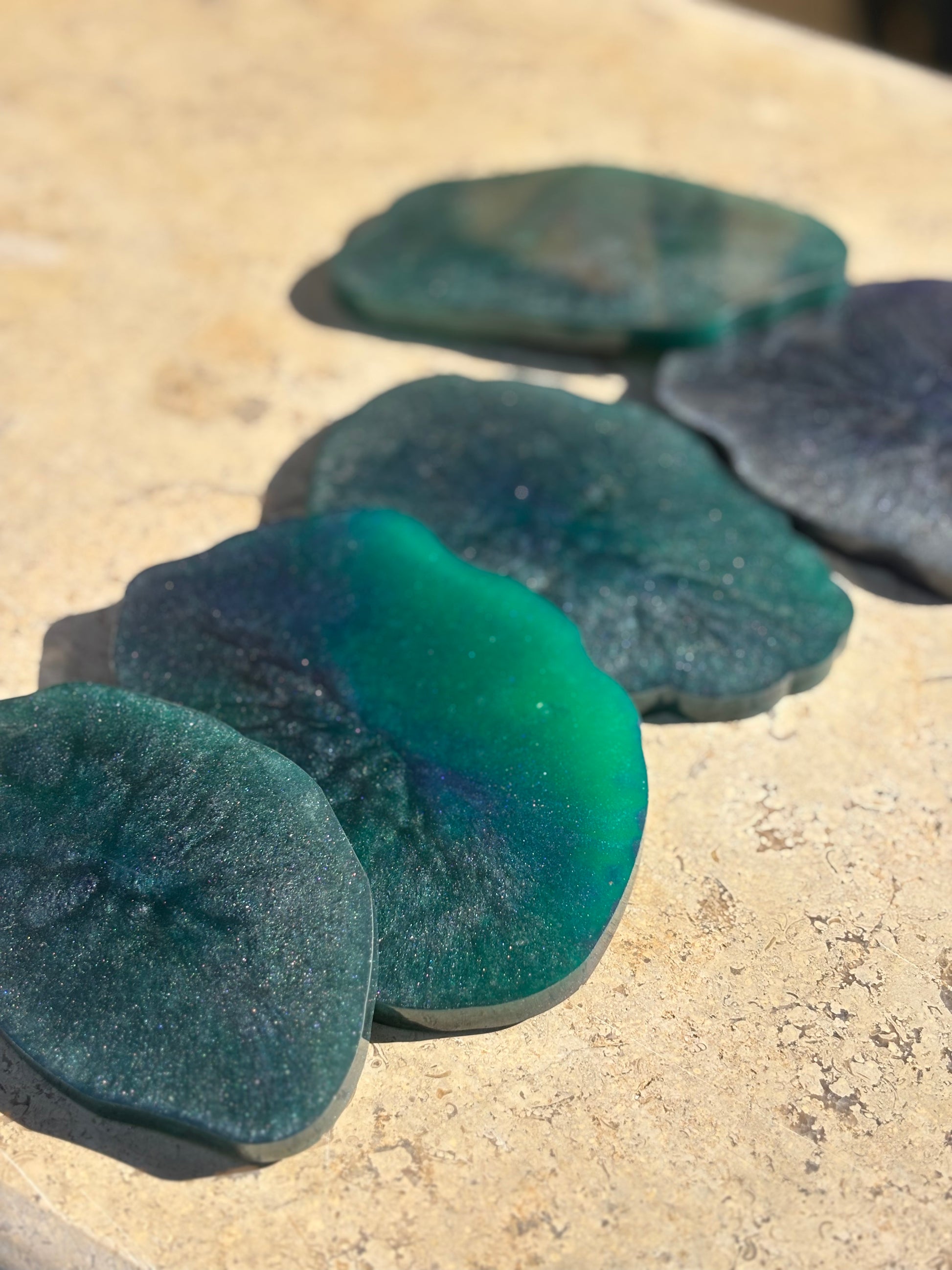 Includes 5 handmade resin coasters in a wavy design and varying sizes.