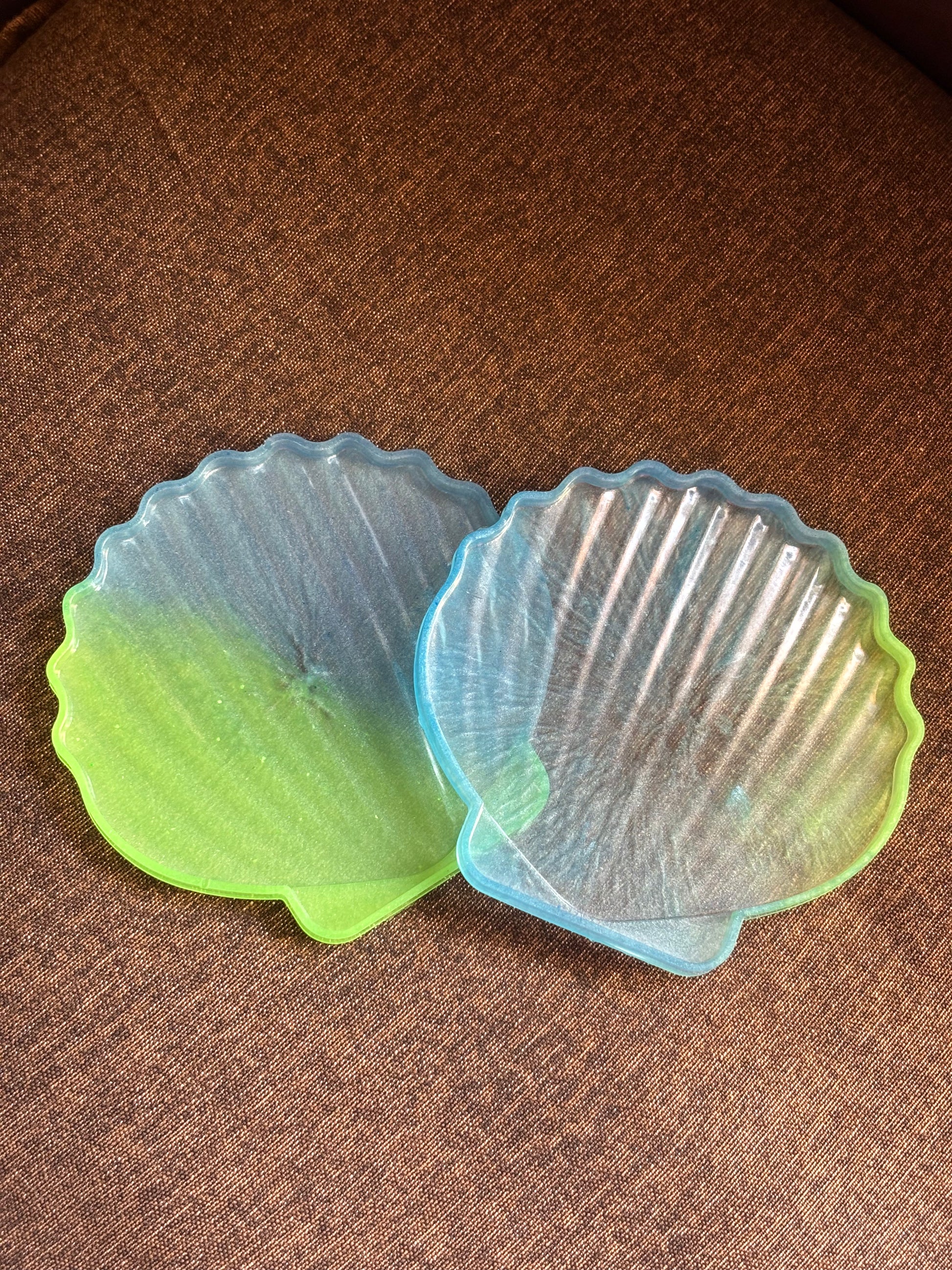 Inspired by the sea, this handmade shell-shaped resin coaster blends calming blue and green tones for a soft, smooth look.