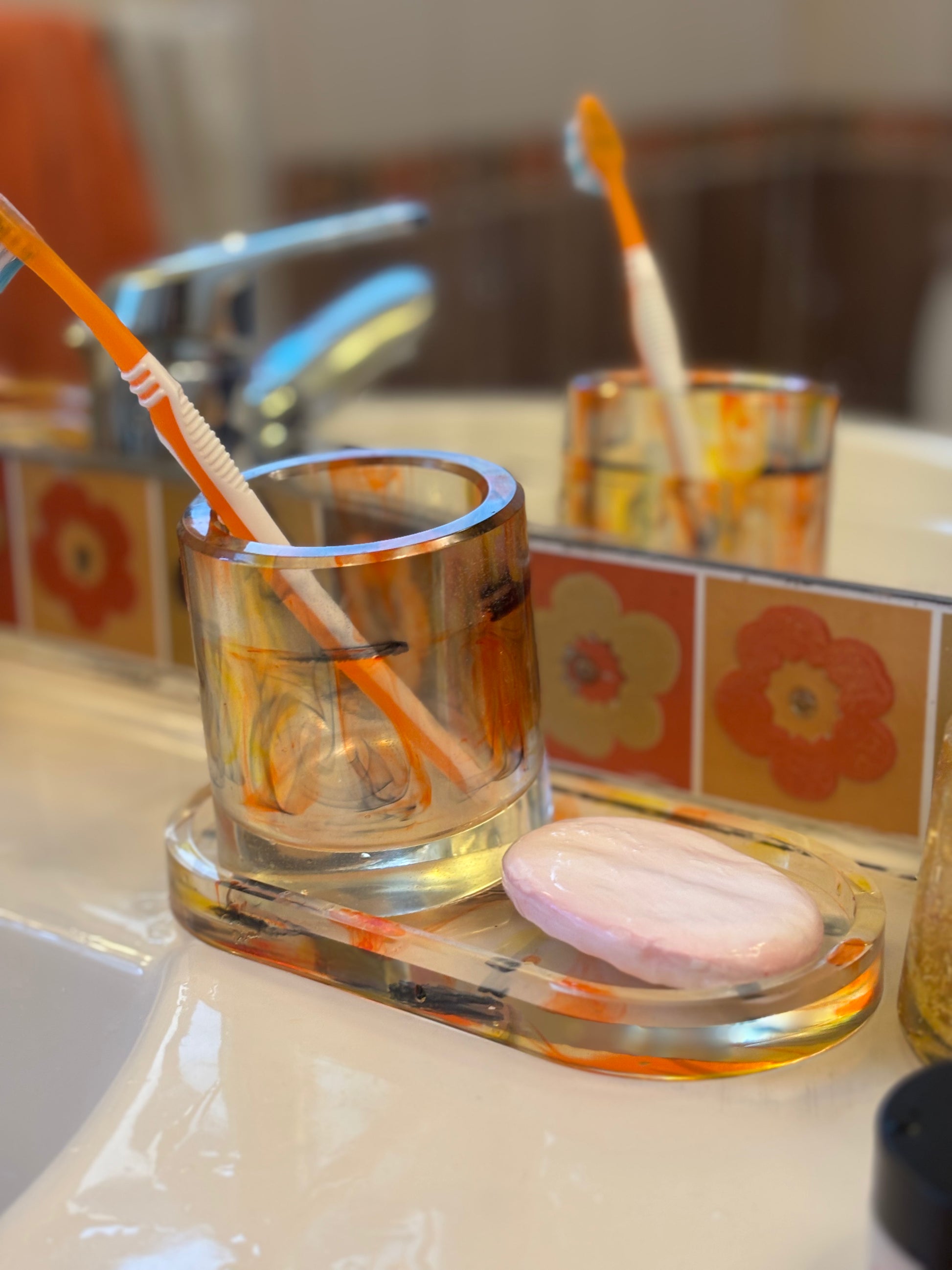 A bold blend of dark grey, fiery orange, and warm yellow swirls come together.