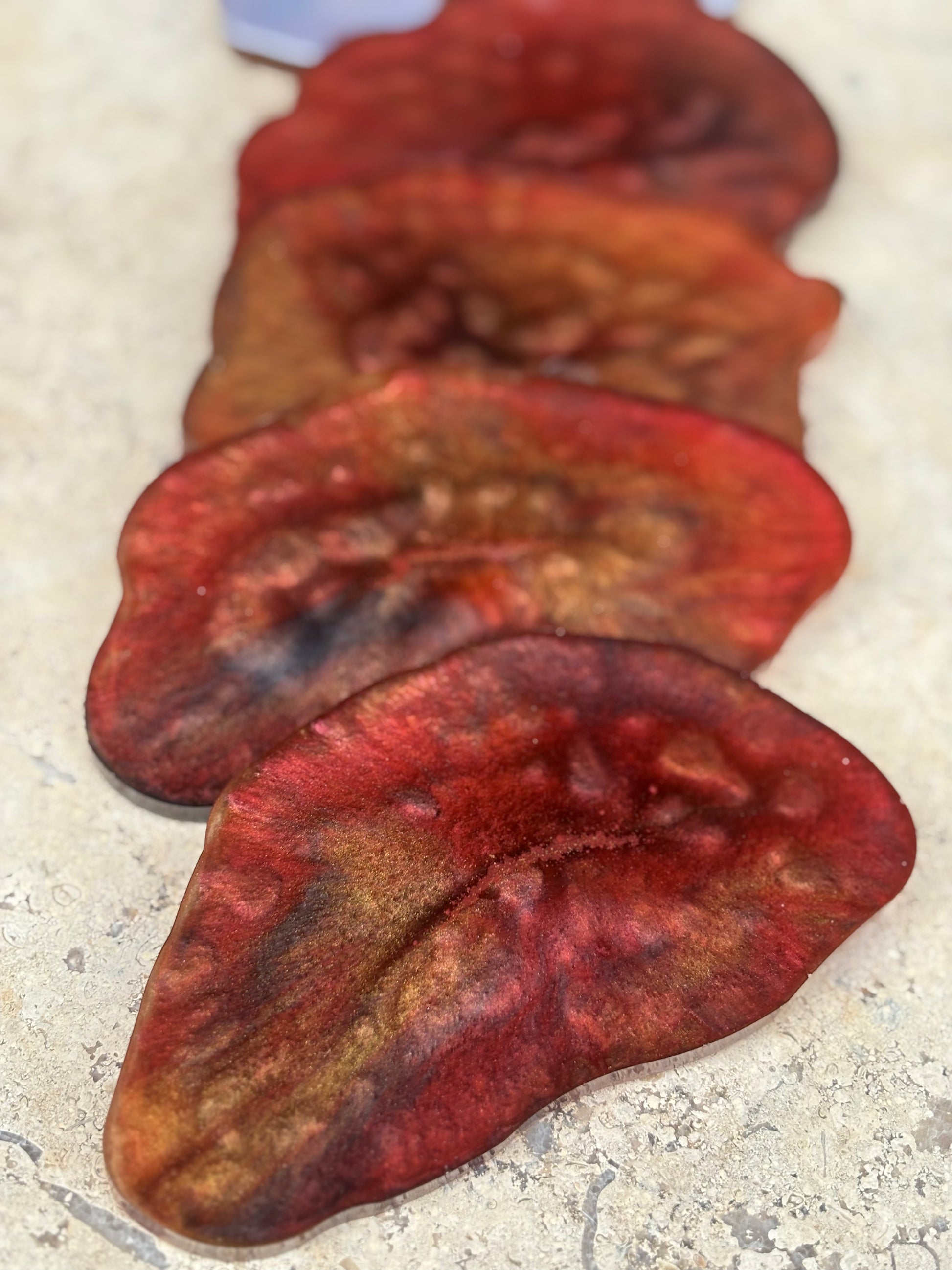 Includes 5 handmade resin coasters in a wavy design and varying sizes.