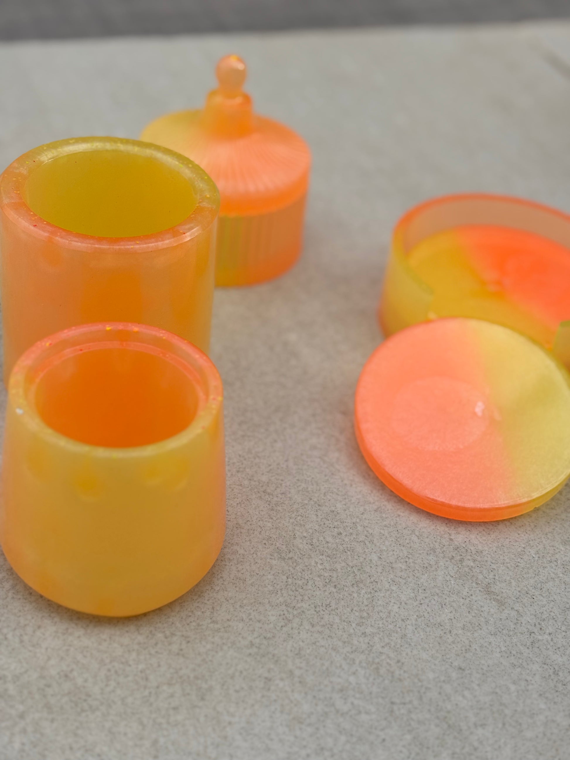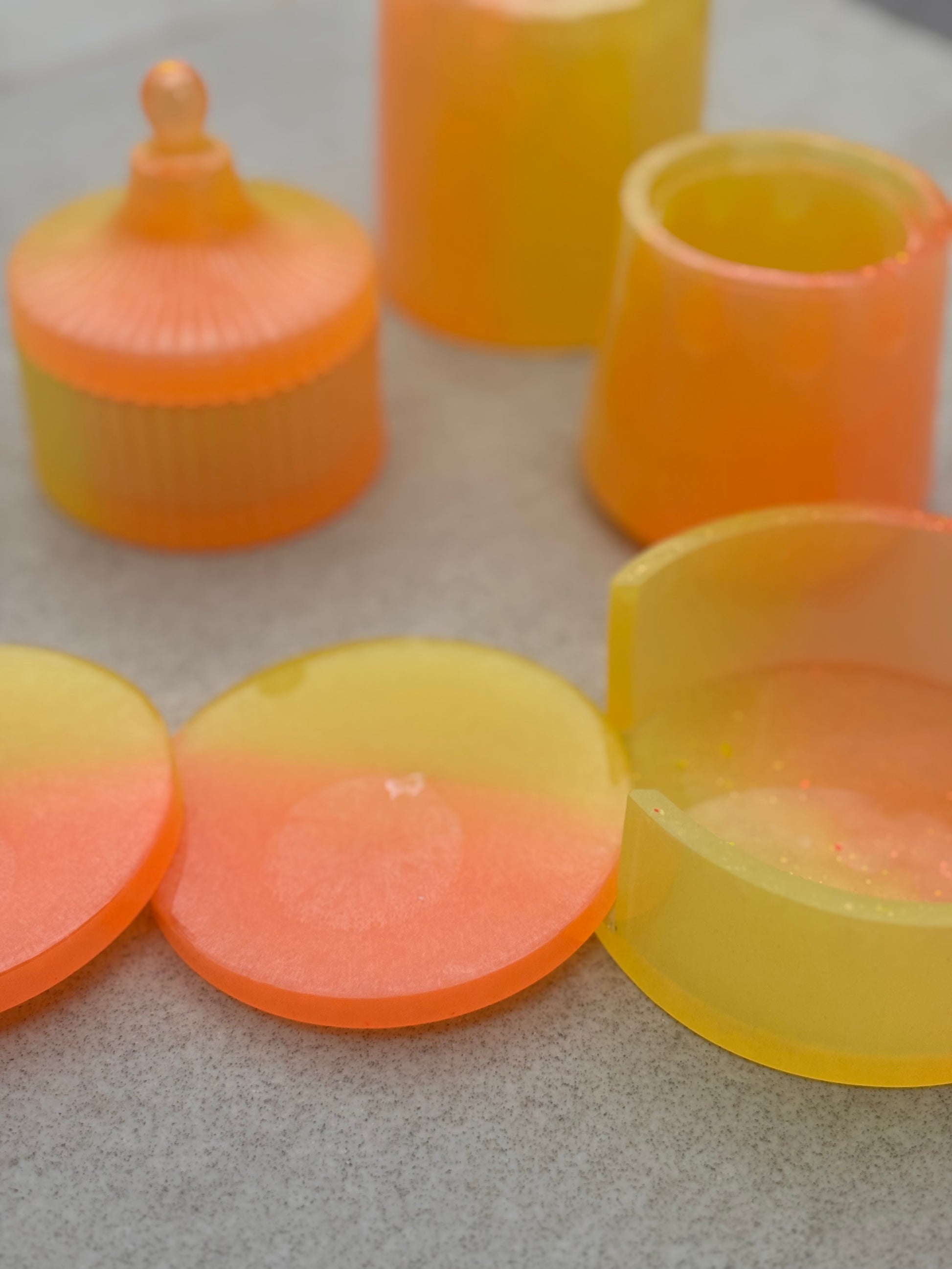 This set includes 3 coasters with a holder, a toothbrush cup, a small cup for cotton buds, and a small box.